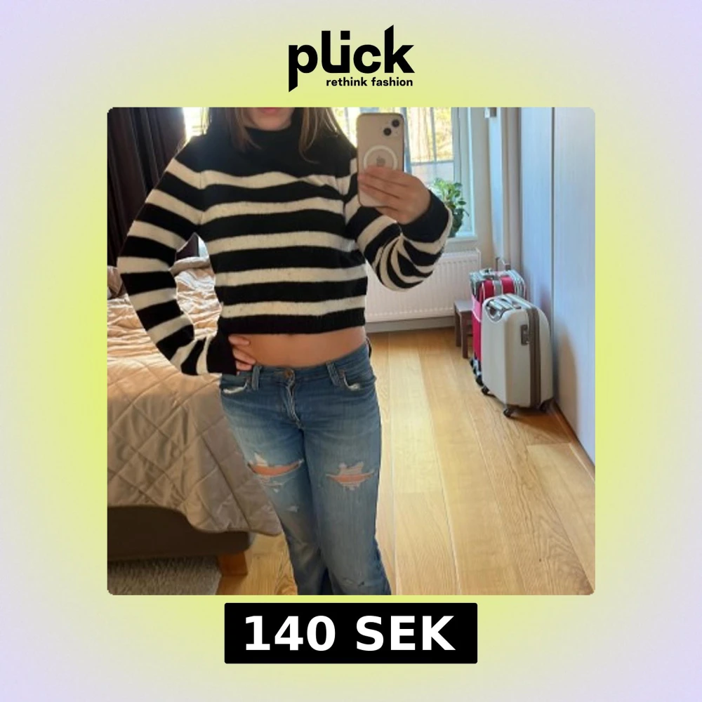 Säljer en svart och vit randig croppad tröja från Stradivarius. Tröjan har lång ärm, ribbad halsringning och är stickad i mjukt material. Den är i M men passar mig som har S🥰