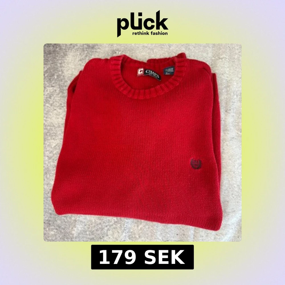 Säljer en snygg röd stickad tröja från Chaps. Tröjan har en rund halsringning och ett diskret broderat emblem på bröstet. Perfekt för kyligare dagar.