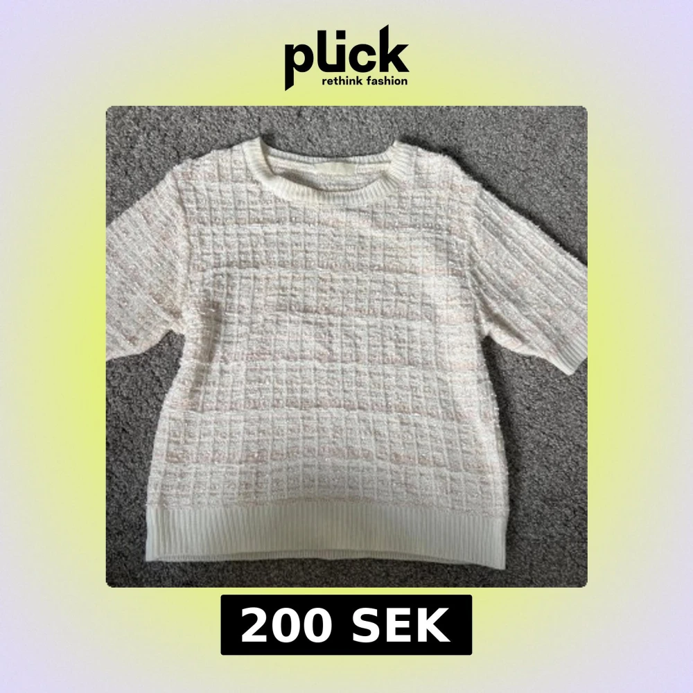 Säljer en vit stickad tröja med korta ärmar och ribbade muddar. Tröjan har ett rutigt mönster och inslag av glittriga trådar som ger en snygg effekt. Perfekt för dig som gillar en stilren men ändå unik look.