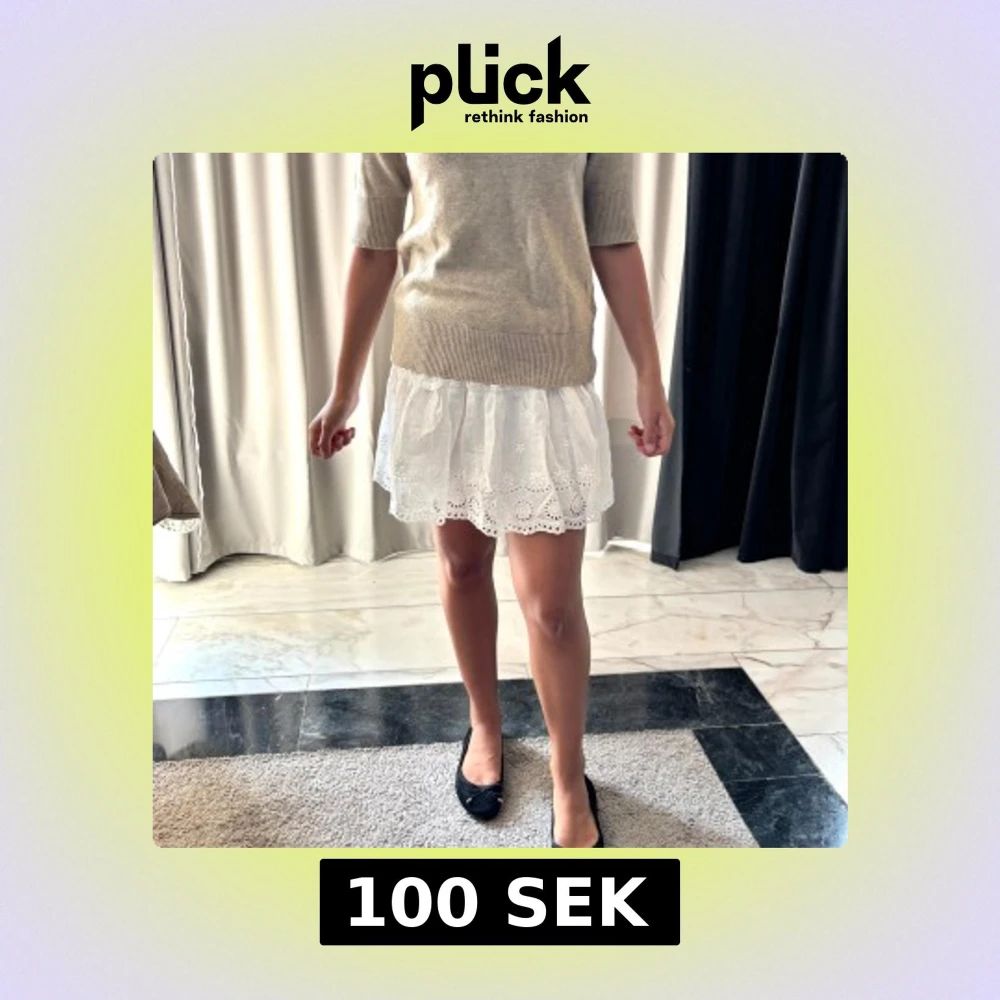 Supersöt vit kortkjol med volanger och broderade blommor. Kjolen har elastisk midja och spetskant längst ner som ger en romantisk vibe. Perfekt att matcha med en stickad tröja. Lätt och luftig, passar grymt till varma dagar. Den är oanvänd! Stolek xs/S.