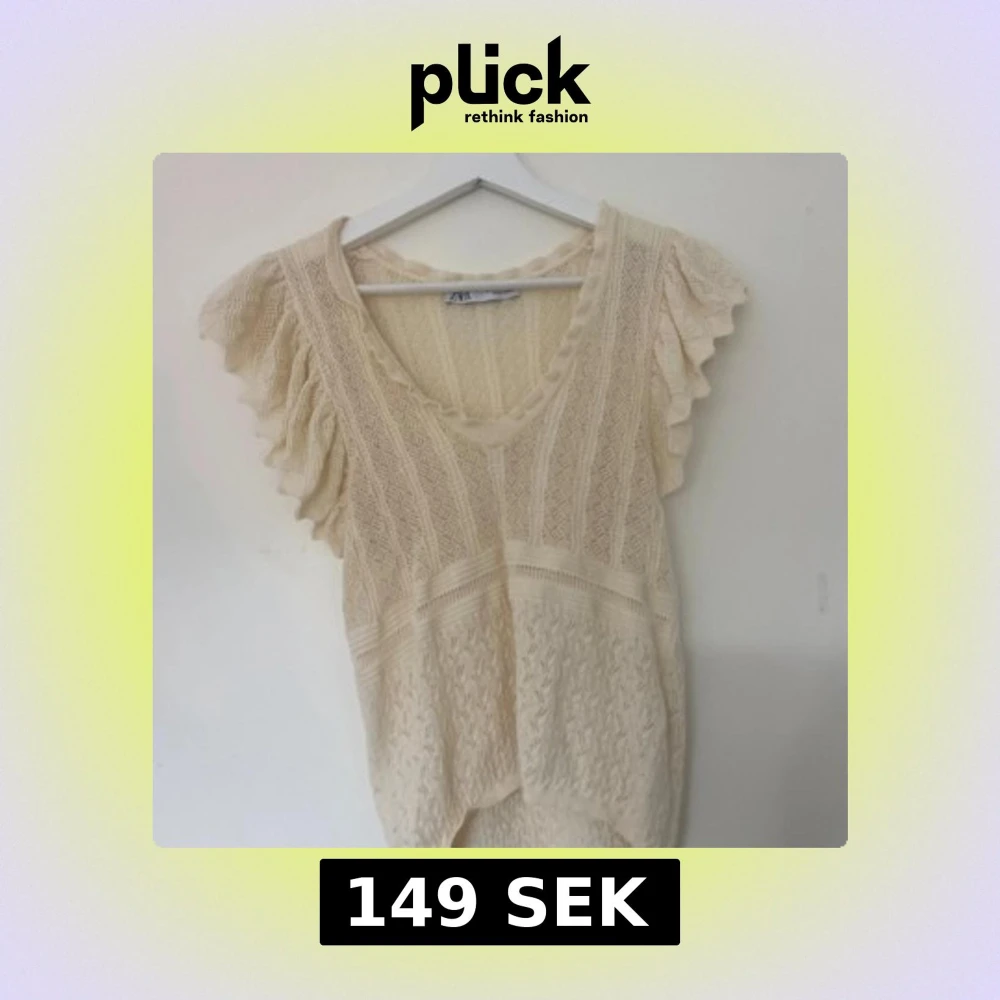 Säljer en krämvit virkad blus från Zara med v-ringning och korta volangärmar. Blusen har ett vackert stickat mönster och är perfekt för vår och sommar. Superfin att styla till både jeans och kjol