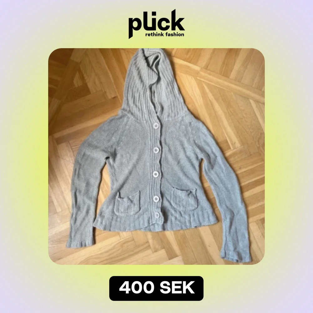 Säljer en mysig grå stickad kofta med huva. Den har långa ärmar och knäpps med stora knappar framtill. Två praktiska fickor finns på framsidan. Perfekt för kyliga dagar!