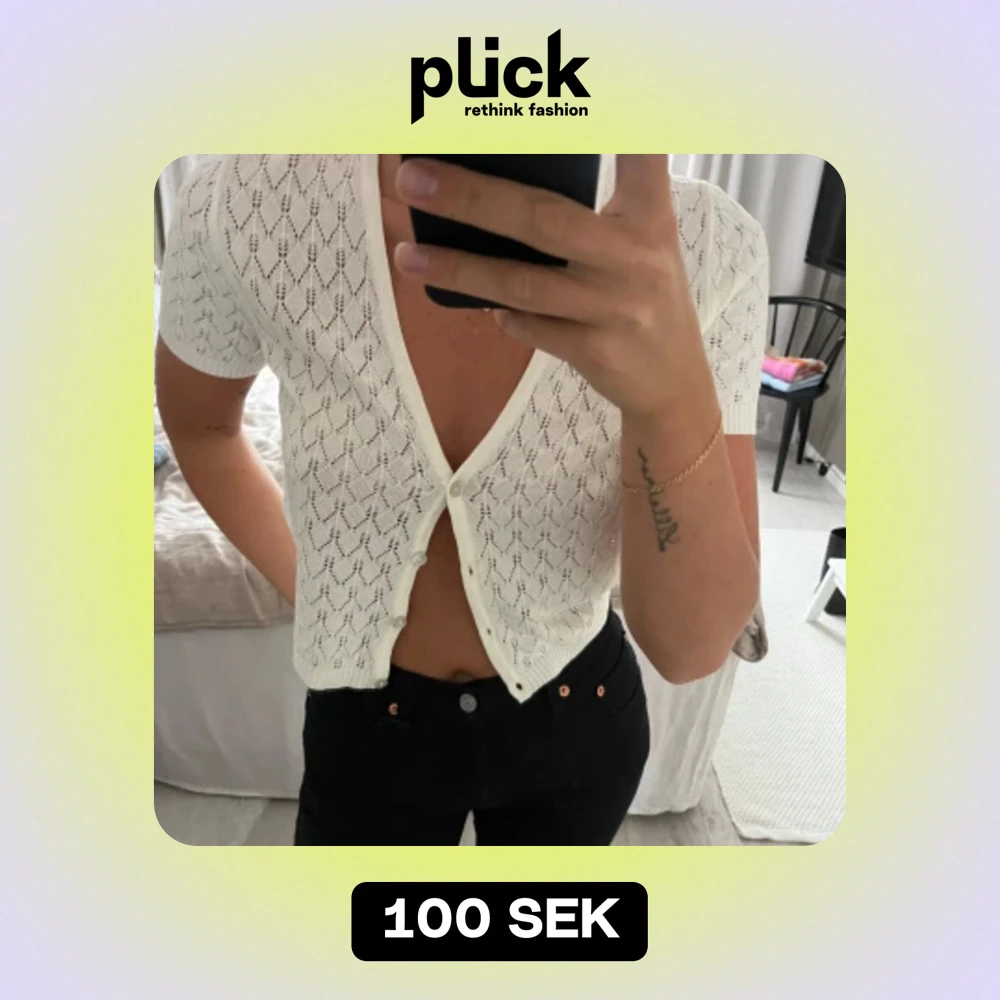 Säljer en superfin vit stickad topp med korta ärmar och v-ringning. Den har ett snyggt hålmönster och knappar framtill. Perfekt för en somrig look eller att ha över en klänning. Toppen är i nyskilda!