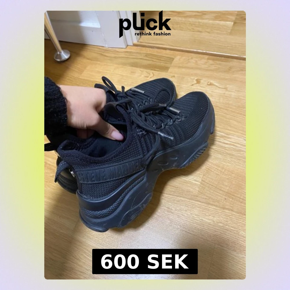 Säljer ett par svarta chunky sneakers från Steve Madden med stickad ovandel och kraftig plattformssula. Skorna har snörning med metall-detaljer och tydlig logga på sidan. Perfekta för dig som gillar streetstyle och vill ha en modern look.