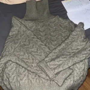 Säljer en mysig grå stickad polotröja från Lindex. Tröjan har ett klassiskt flätmönster och en hög polokrage som håller dig varm under kyliga dagar. Perfekt för höst och vinter!