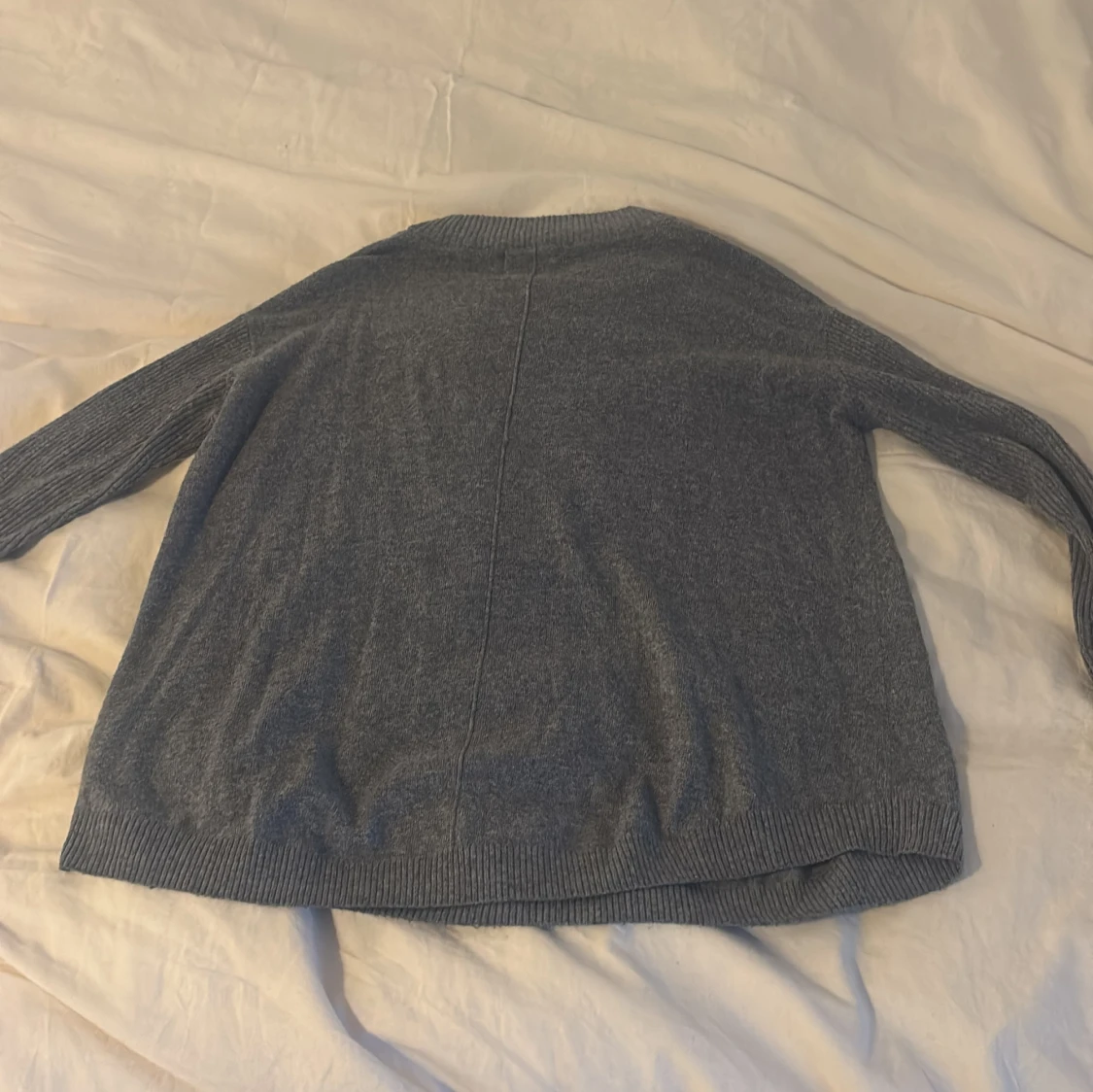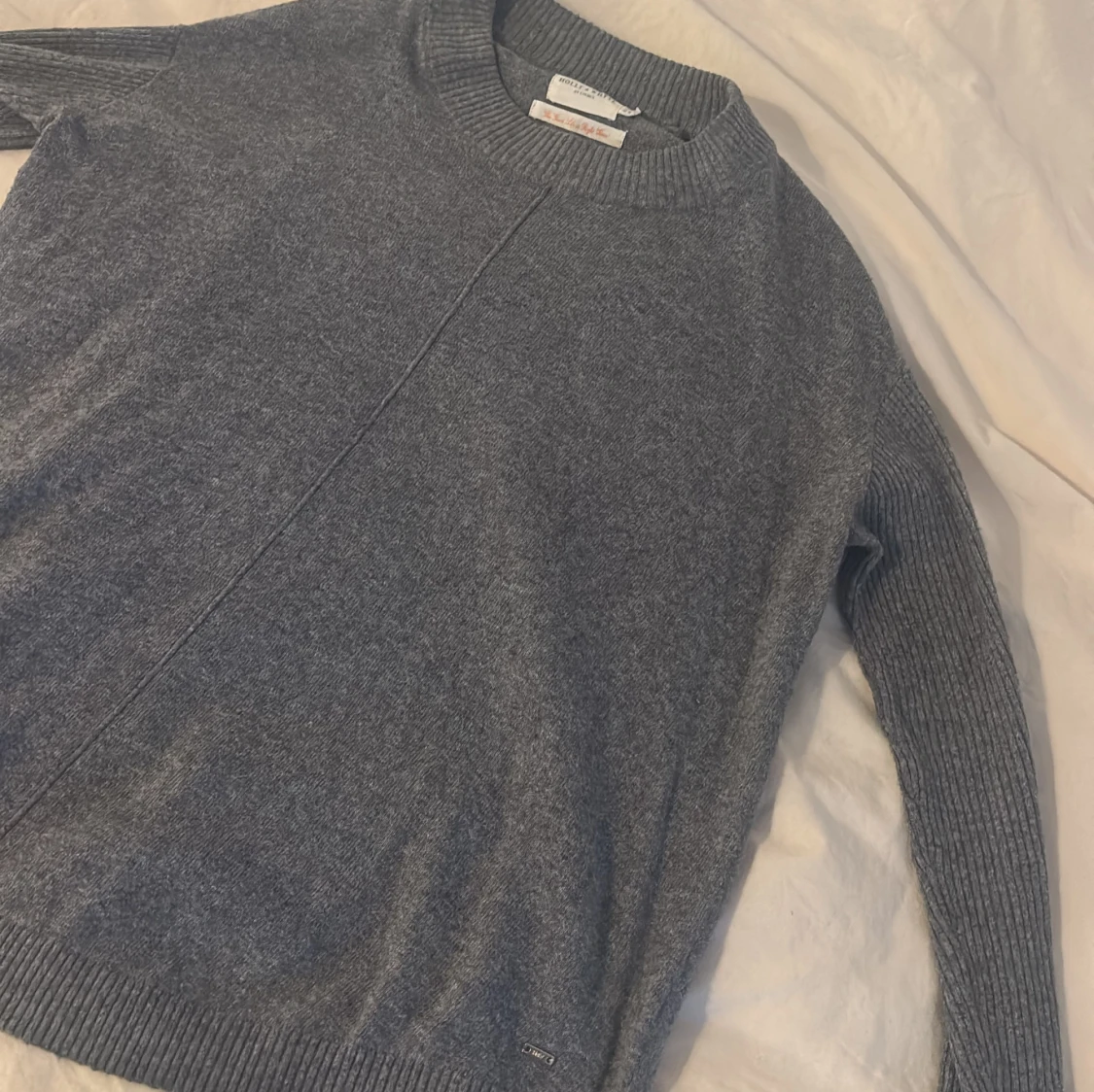 Mysig grå stickad tröja från Holly & whyte med rund hals och ribbade ärmar. Långärmad modell med diskret söm framtill och liten metallbricka vid nederkanten. Perfekt för kyliga dagar och enkel att matcha med jeans eller kjol. Storlek xs/s.