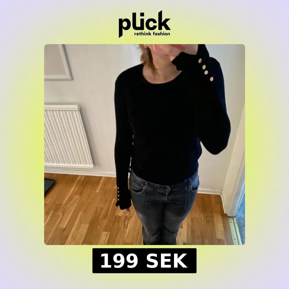 Snygg svart långärmad tröja med guldiga detaljer på ärmarna. Tröjan är i bra skick!! Passar bra till både vardags och festligare tillfällen💕💕