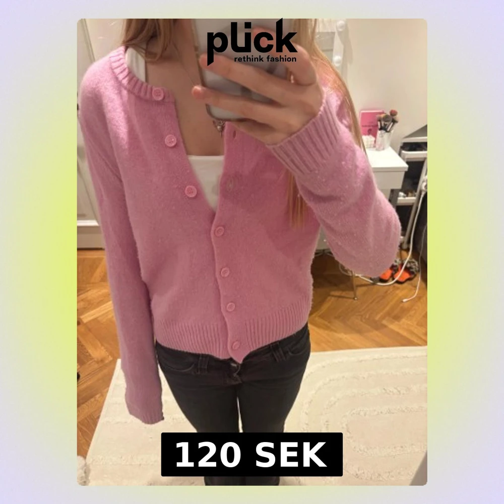 Säljer en söt rosa kofta med rund hals och matchande rosa knappar. Koftan har långa ärmar och ribbade muddar vid ärmslut och nederkant. Perfekt att slänga över en topp för en chill och färgglad look.