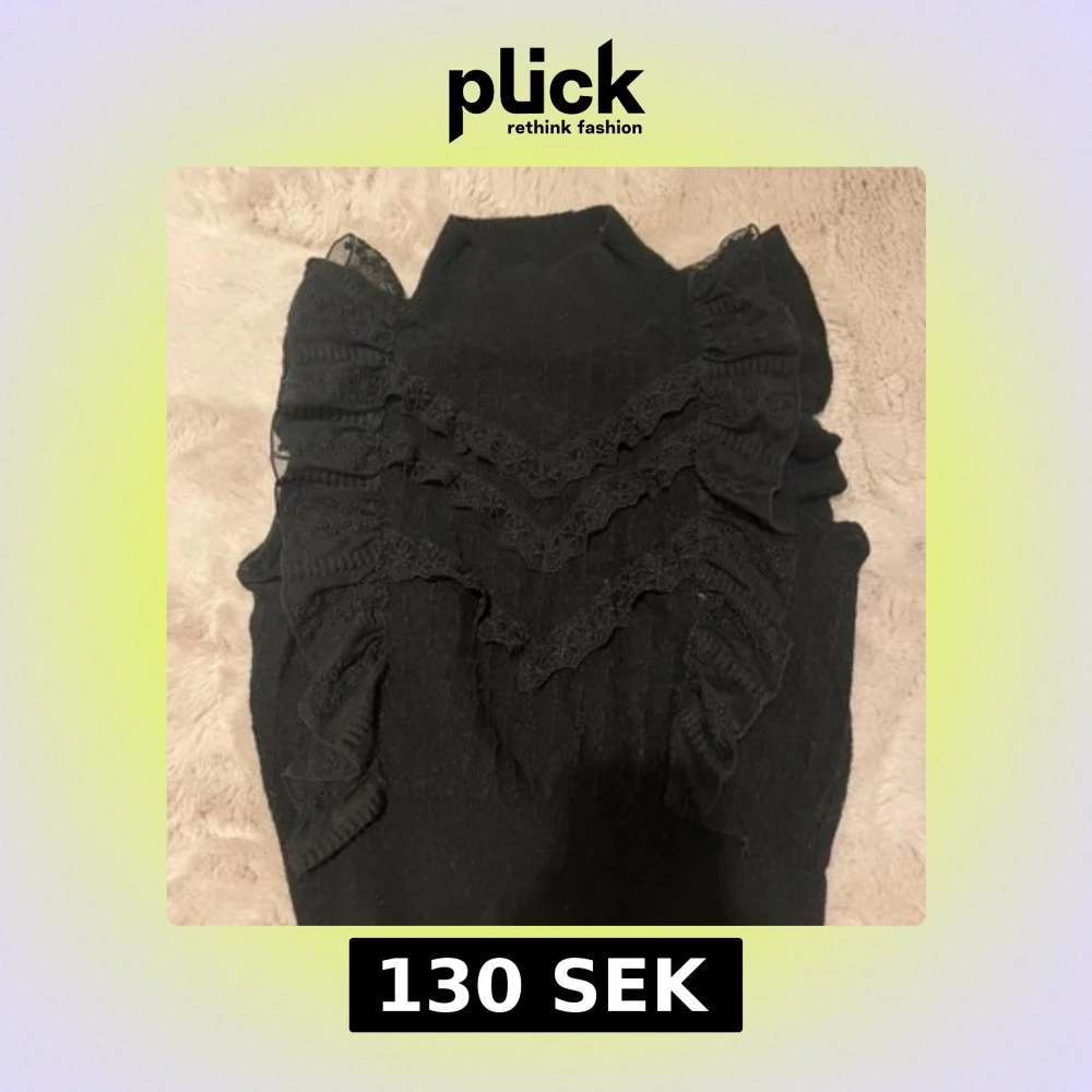 Supersnygg svart stickad tröja med höghalsad krage och dekorativa volanger i spets längs axlarna och framtill. Tröjan har en feminin och trendig look med coola detaljer som ger extra edge till outfiten. Mycket bra skick. Passar xs-L