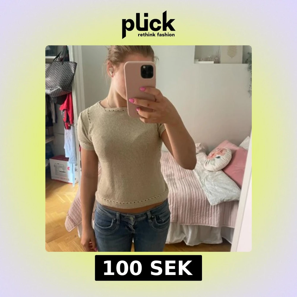 Säljer en ljusbeige stickad topp med korta ärmar och rund hals. Toppen har fina håldetaljer längs kanterna och är lätt croppad i modellen💗Står ingen storlek eller märke men uppskattar den att vara Xs/S. Pris går alltid att disskutera!