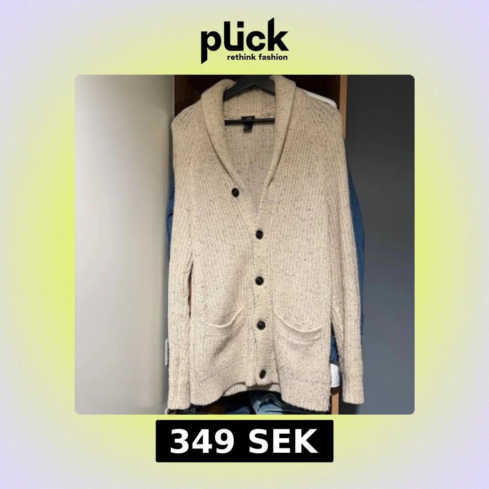 Beige stickad cardigan från H&M med knappar och två fickor framtill. Koftan har bred krage och bruna mockadetaljer på armbågarna. Perfekt för lager-på-lager under höst och vinter. Sitter stort i storlek tycker jag