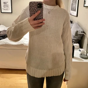 Säljer min vita stickade tröja som tyvärr aldrig kommer till användning. Då den är lite längre i modellen passar den perfekt till en kjol men den är självklart väldigt snygg till ett par jeans också🙌skriv för fler bilder
