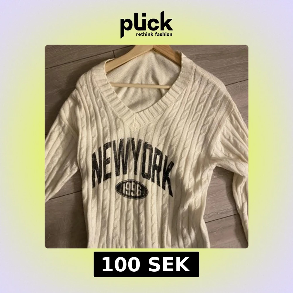 Säljer en vit stickad tröja med ett coolt New York-tryck och årtalet 1996 på framsidan. Tröjan har en v-ringad hals och långa ärmar, perfekt för en avslappnad stil. strl S