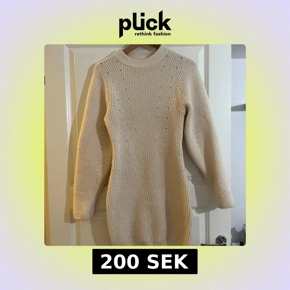 Mysig crémevit stickad klänning med långärmad design. Perfekt för kyligare dagar med sin varma och bekväma passform. Den har ett enkelt men stilrent mönster som ger en extra touch och kramar om kroppen på ett fint sätt.