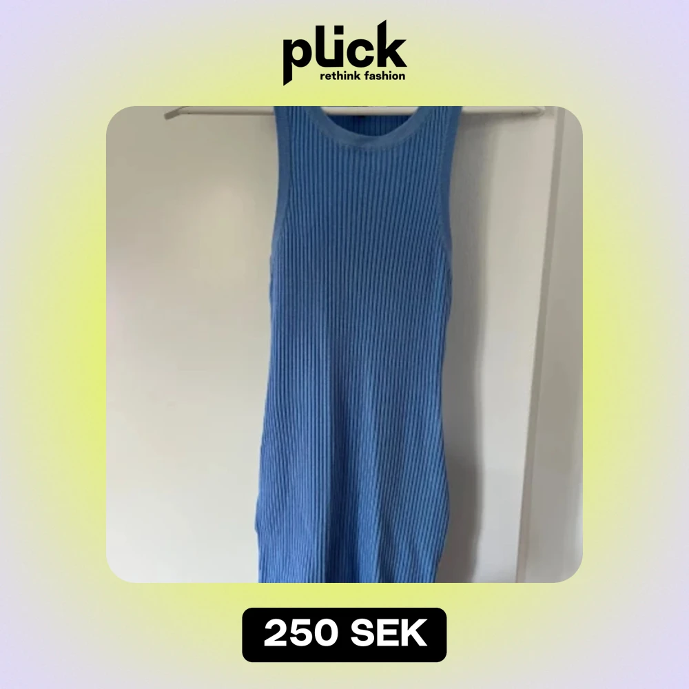 Blå klänning som följer kroppen, hög i halsen och ribbad i tyget