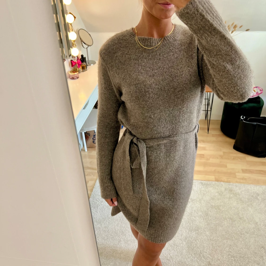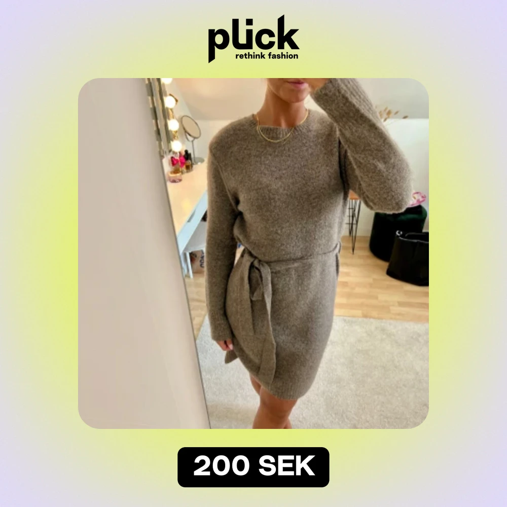 Supermysig brun stickad klänning med knytband i midjan. Storlek M men passar även XS-S. Stretchig och mjuk. Är 167 cm lång och vanlig S-M.