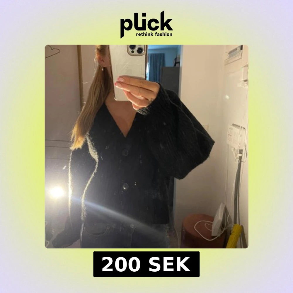 Mysig svart stickad kofta med v-ringning och stora knappar framtill. Koftan har långa, lite pösiga ärmar och en loose passform .