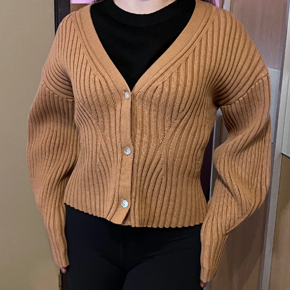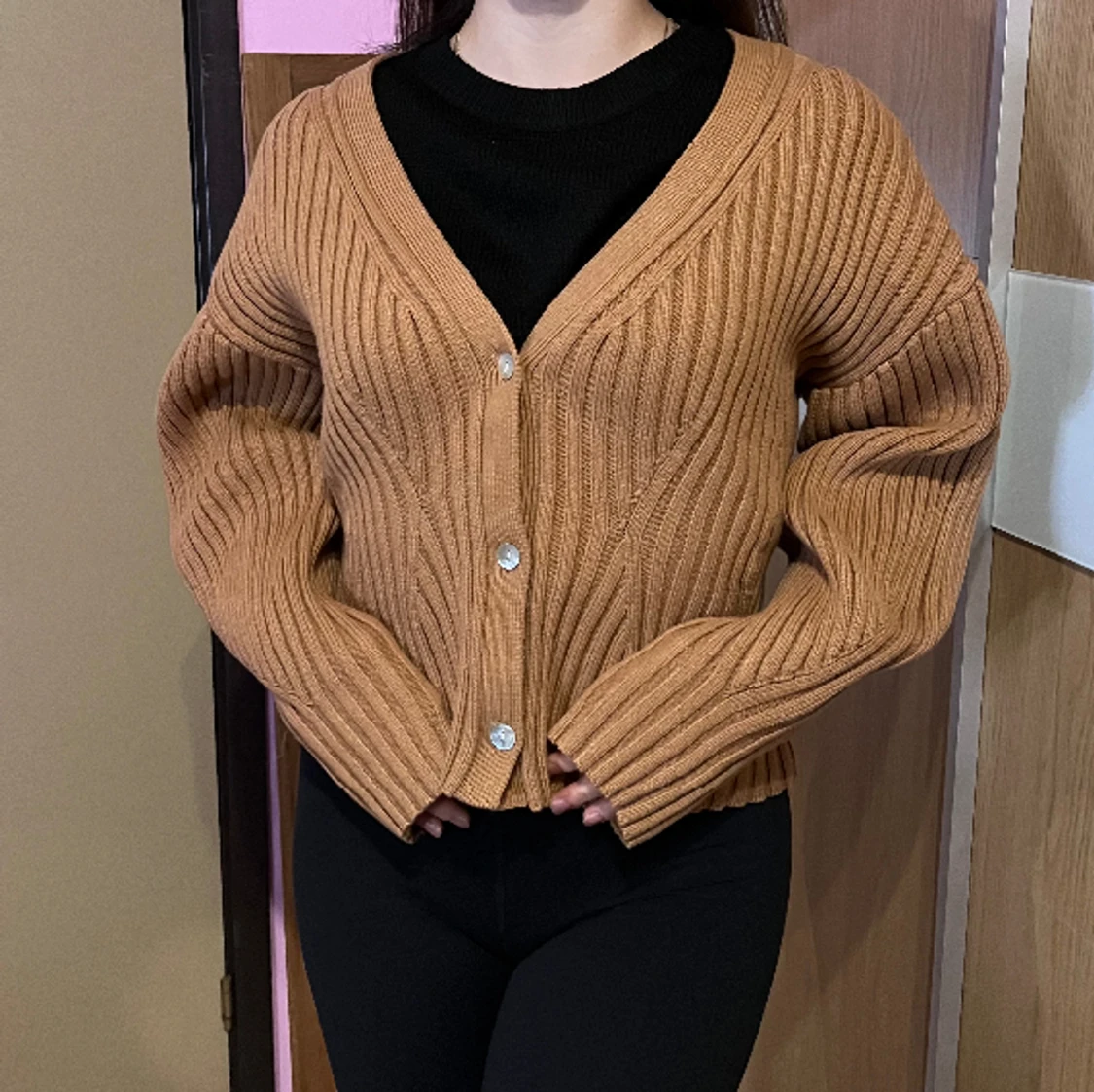 Helt ny kofta i stl M. Prislapp kvar. Modellen är stl S därav ser koftan ut att vara stor.