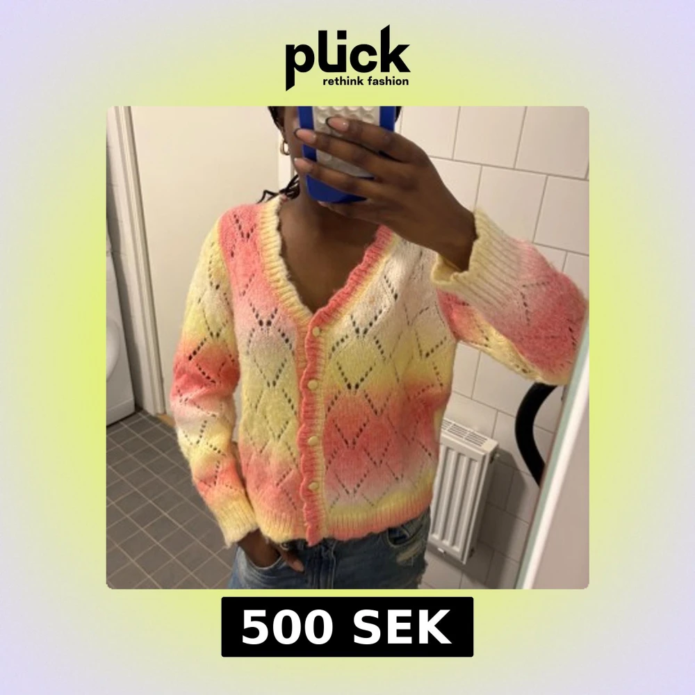 Superfin stickad kofta i pastellfärger med rosa, gul och vit ton. Koftan har ett öppet hålmönster, v-ringning och knappar framtill. Mjuk och fluffig! Super unik🌸🌸