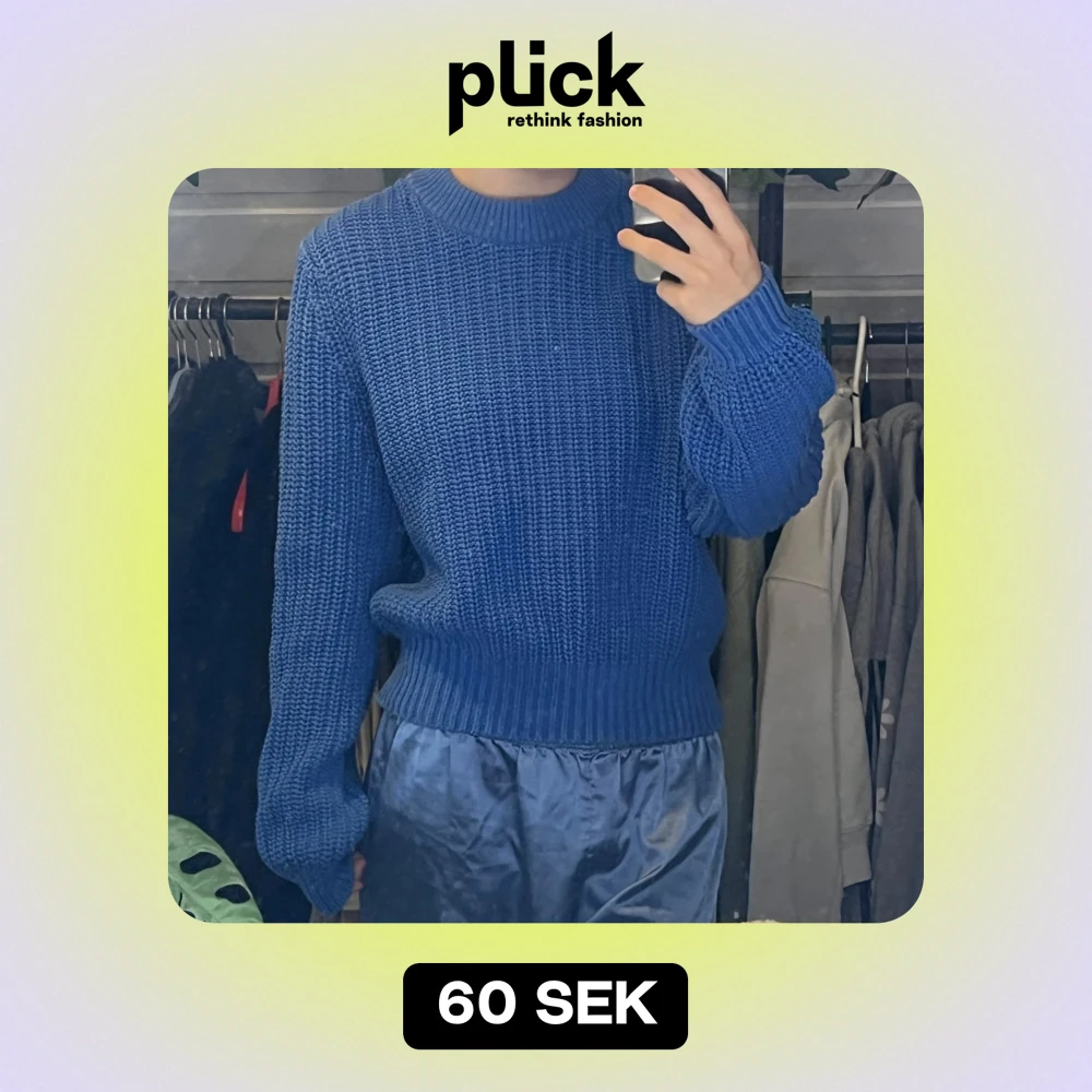 Säljer en snygg blå stickad tröja med rund hals och långa ärmar. Perfekt för kyligare dagar och ger en stilren look. Tröjan har en ribbad kant vid ärmslut och nederkant.