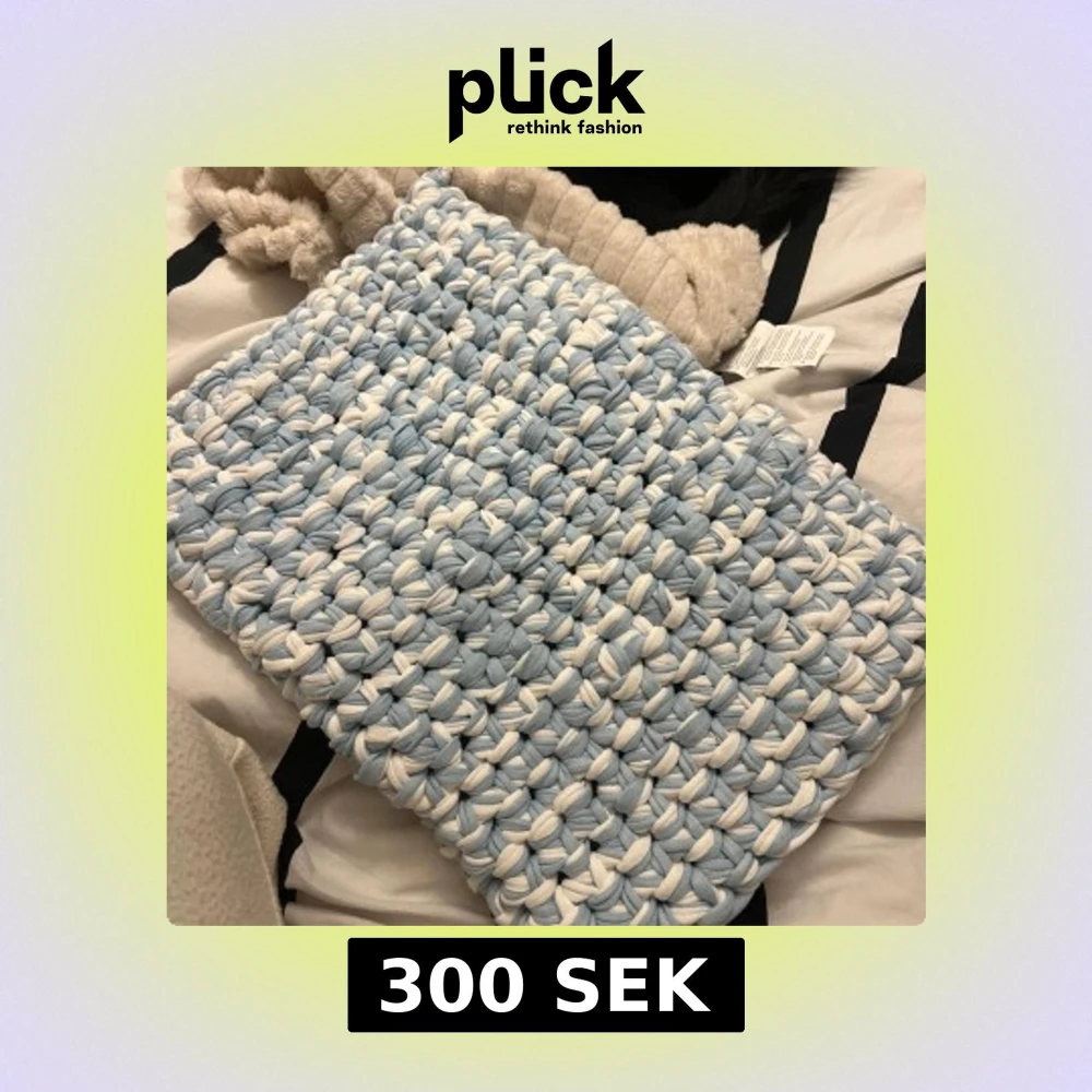 Säljer en handgjord stickad datorväska i ljusblått och vitt. Väskan kan köpas som denna eller i annan färg kombination mixad eller ensam färg (vit, brun, grå, blå, svart)