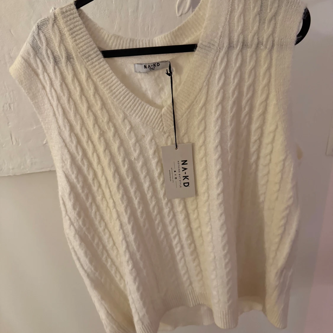 Säljer en krämvit stickad väst från NA-KD i storlek M. Västen har v-ringning och ett klassiskt kabelstickat mönster. Helt oanvänd med alla lappar kvar💌