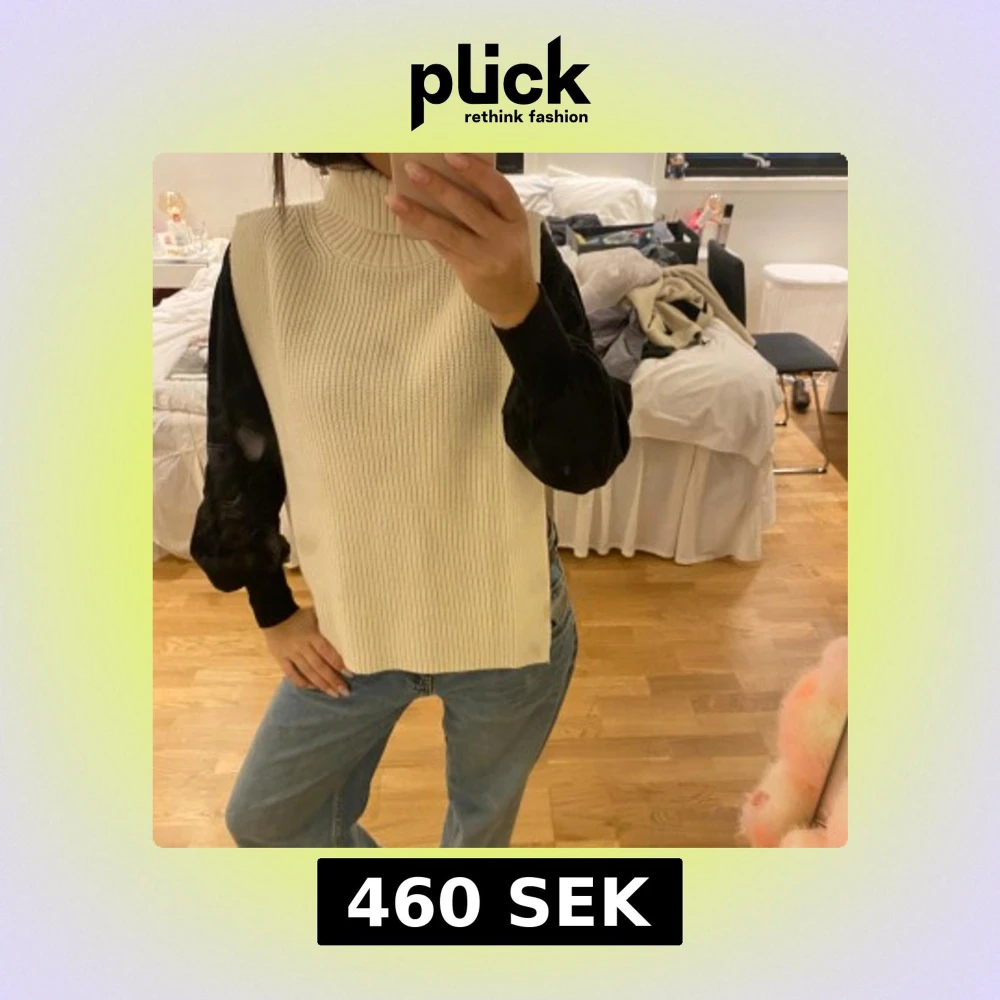 Säljer en chunky stickad slippover i offwhite från H&M. Modellen är ärmlös med hög krage och har en rak, loose fit med slitsar i sidorna. Perfekt att slänga över en skjorta eller långärmad tröja för en trendig lager-på-lager-look. Kom med bud!