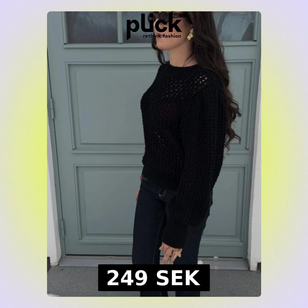 Säljer en svart stickad tröja med snygga hålmönster och rund hals. Tröjan har långa ärmar och är perfekt för lager på lager och ger en cool, avslappnad vibe. Passar även snyggt till ett par jeans nu i vinter!