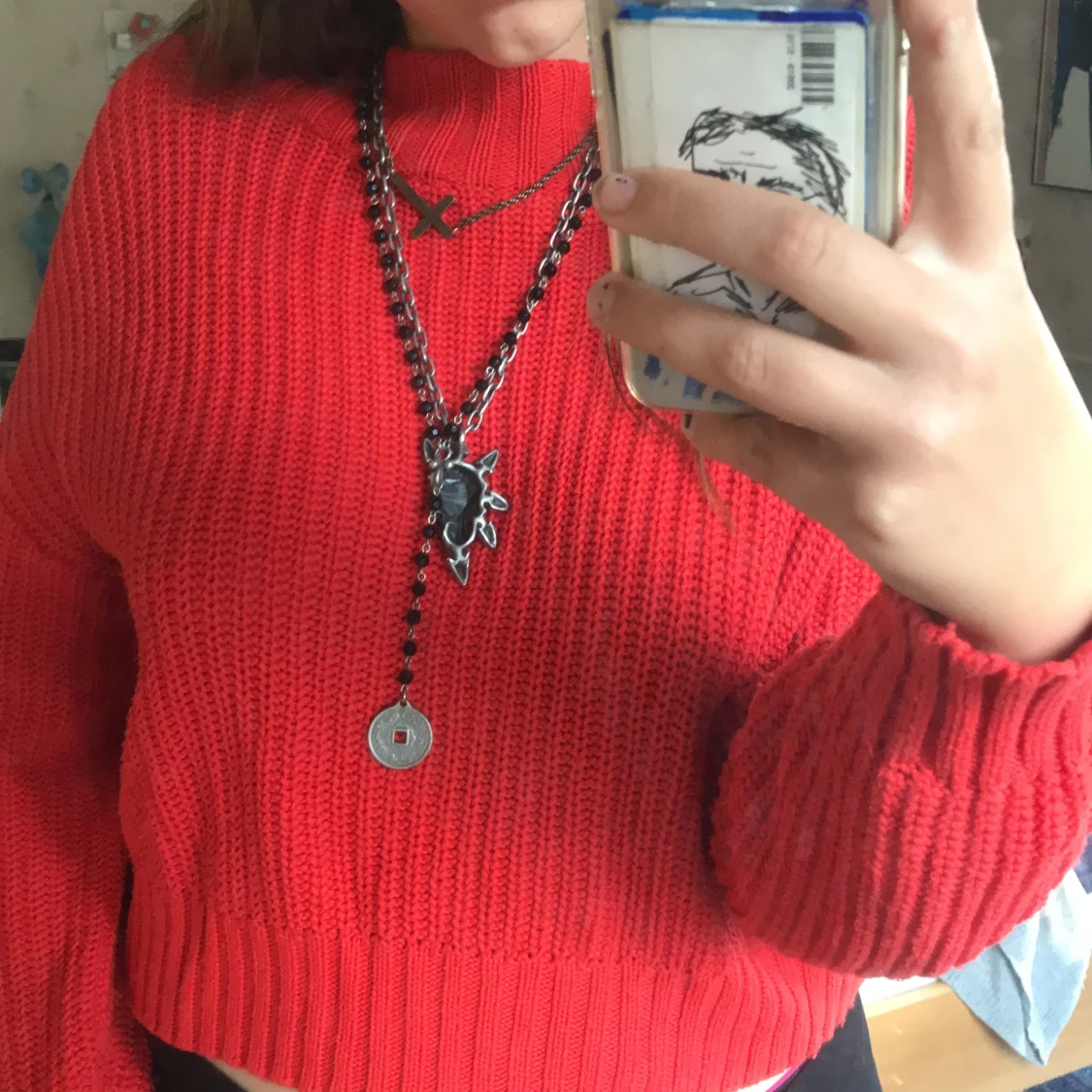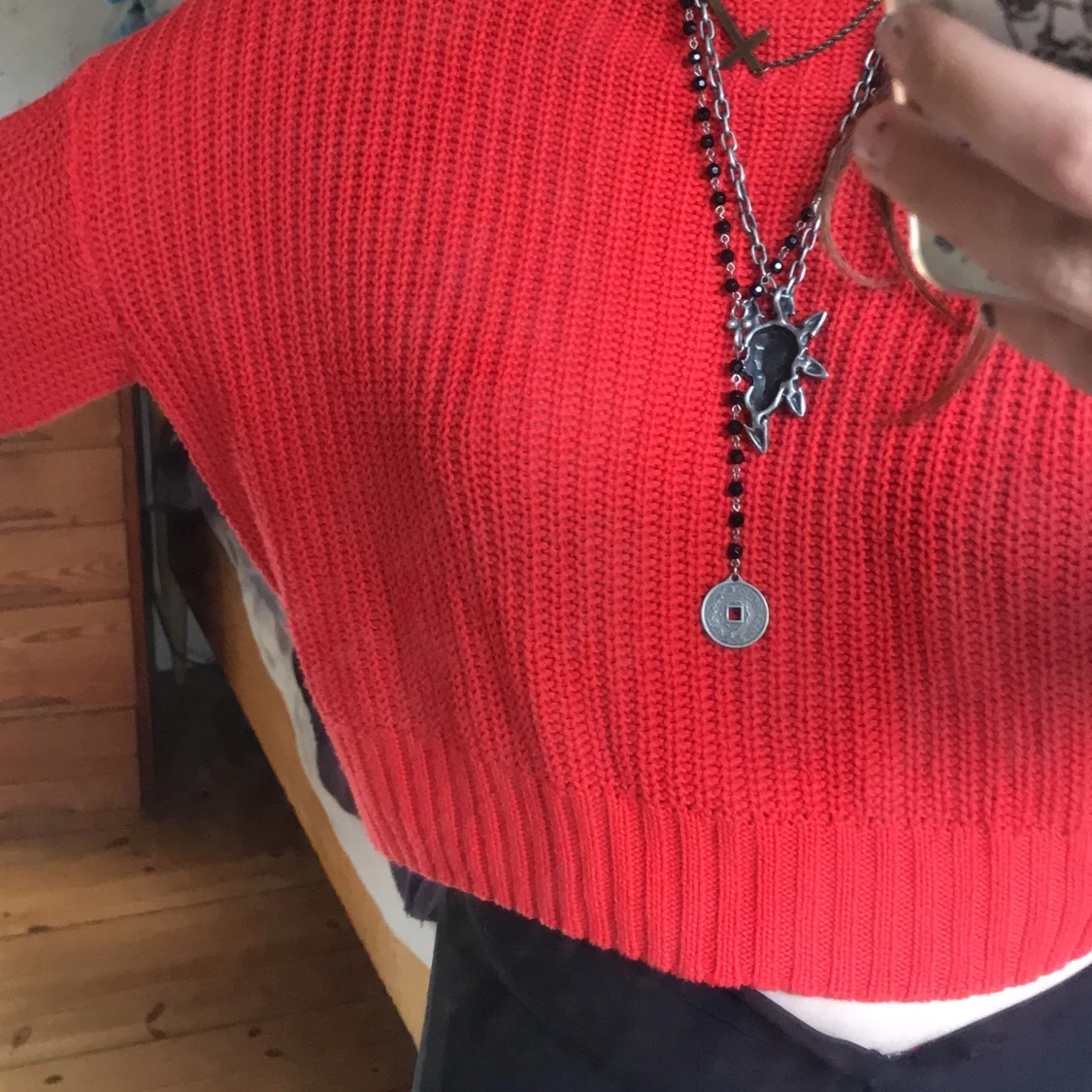 Superskön och mysig stickad tröja. Den är väl använd så lite sliten är den. Jättefin röd färg och supermysig. Ett måste till hösten!!🍁Möts gärna upp i Stockholm men kan även frakta. Köparen står för frakt!💕