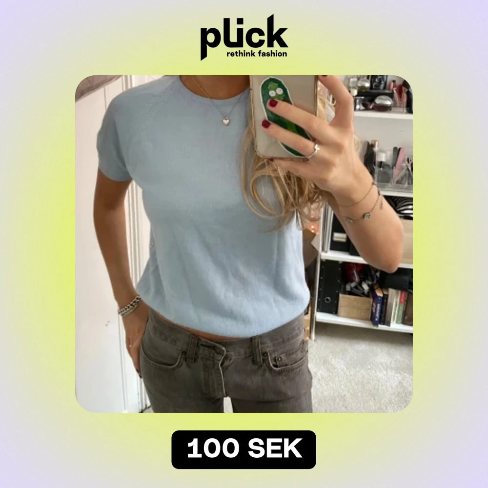 Ljusblå stickad t-shirt köpt second hand, storlek S