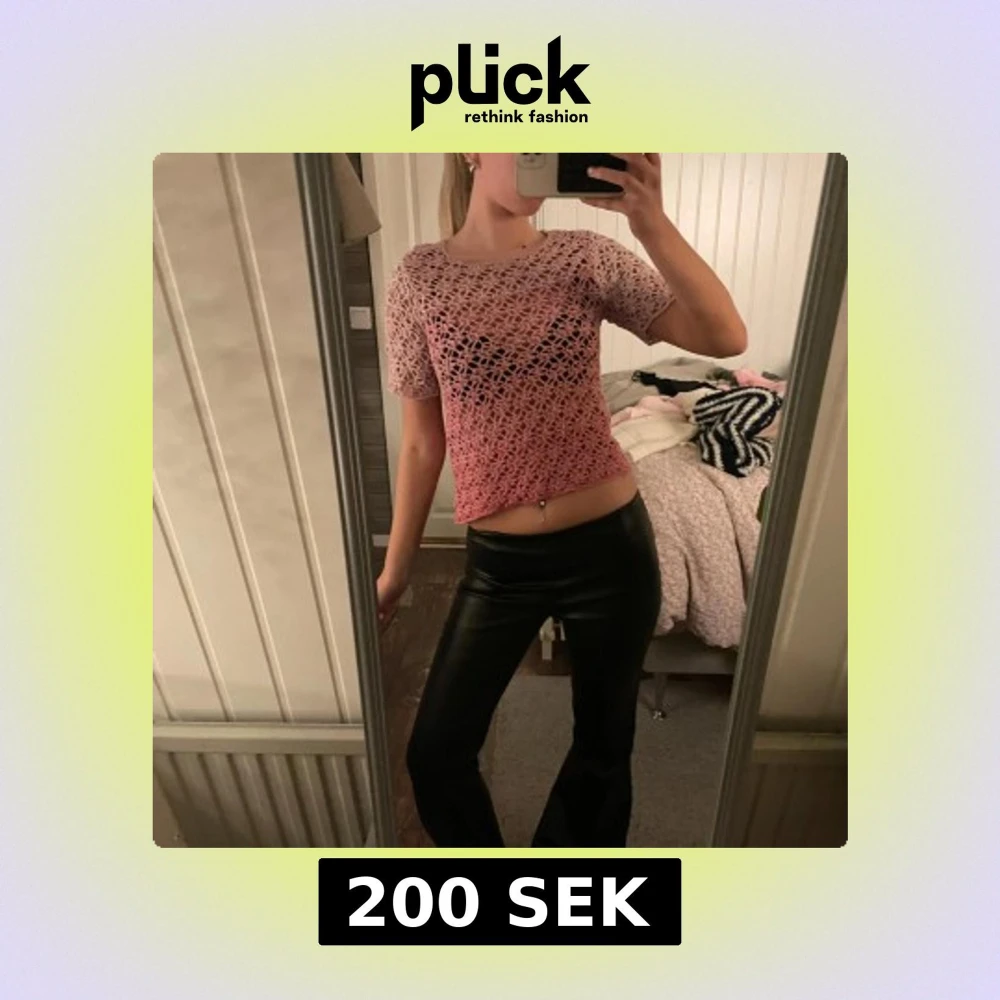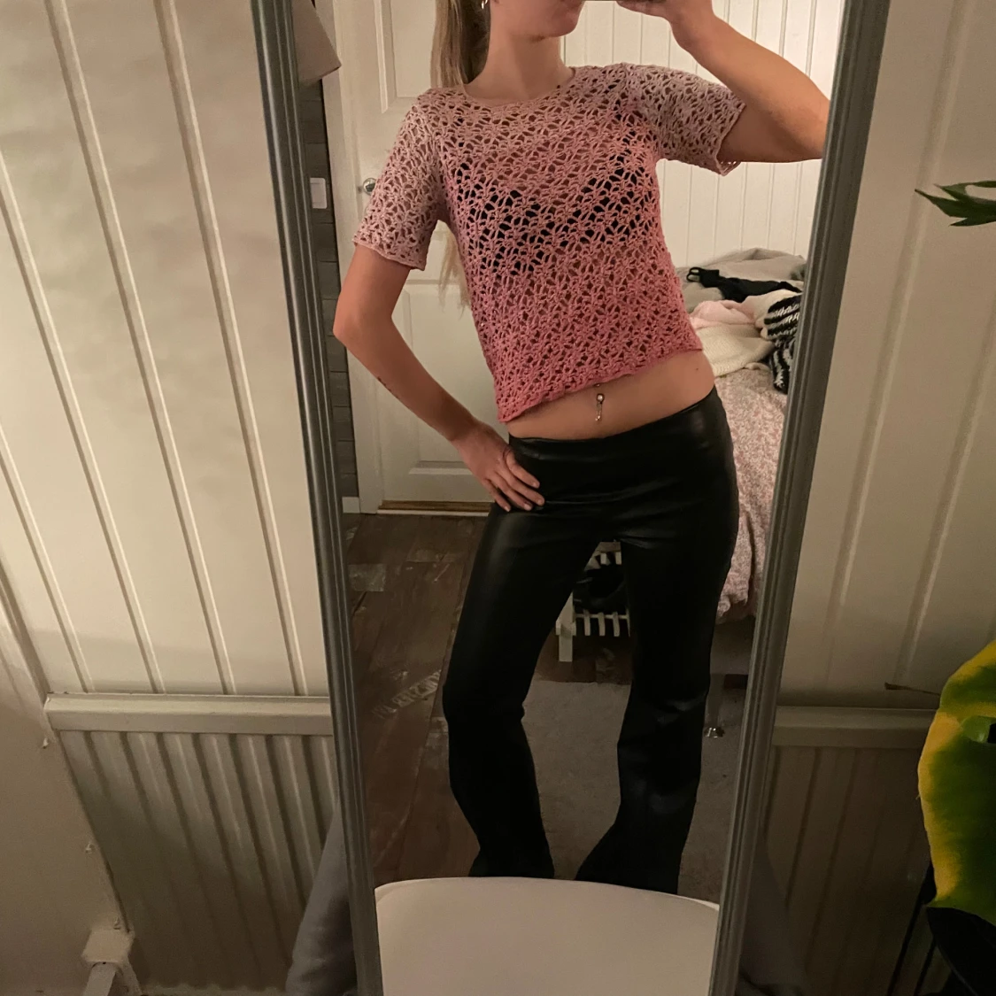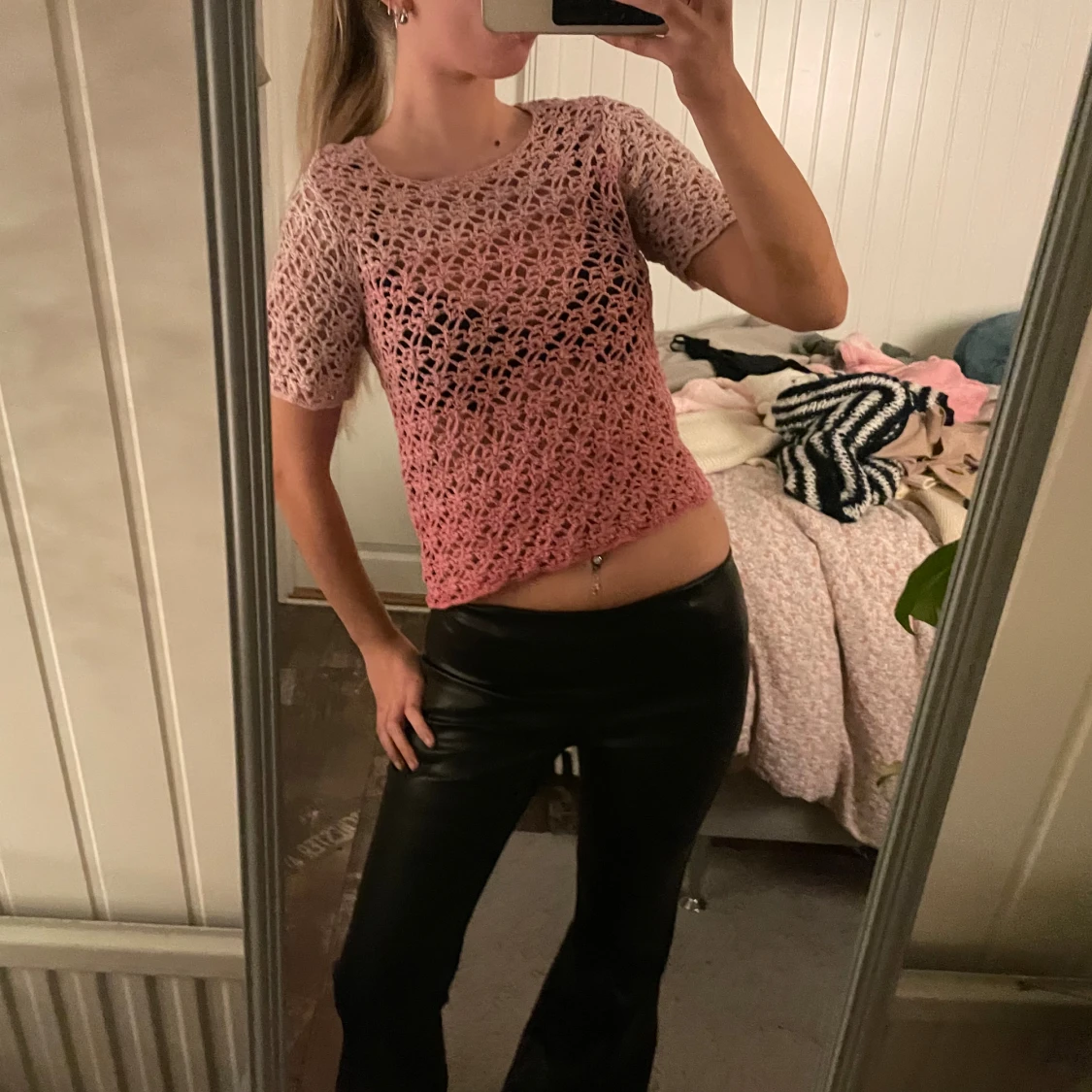 Säljer en handvirkad topp i rosa nyanser med kort ärm och rund hals. Toppen har ett luftigt, genombrutet mönster och är croppad i modellen. Perfekt för dig som gillar unika plagg med boho-vibe.