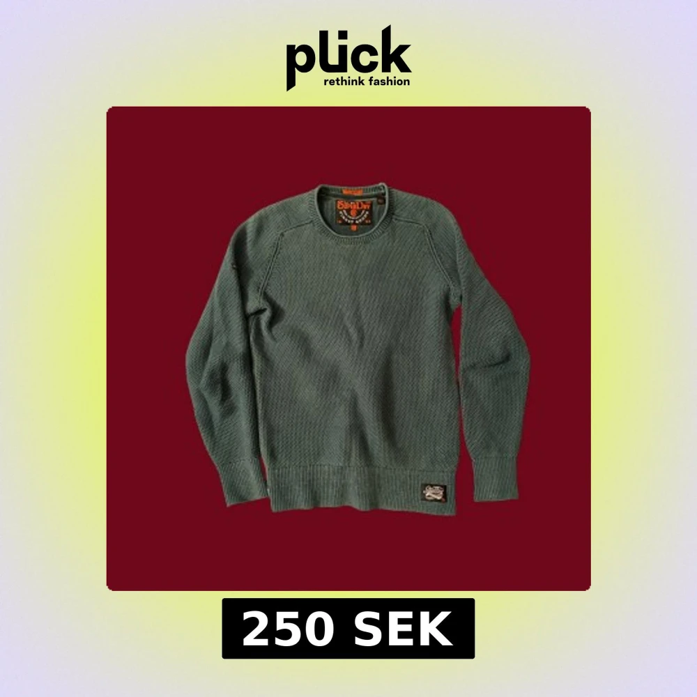 Snygg grön stickad tröja från Superdry i storlek S. Tröjan har rund hals och ett diskret Superdry-märke vid nederkanten.