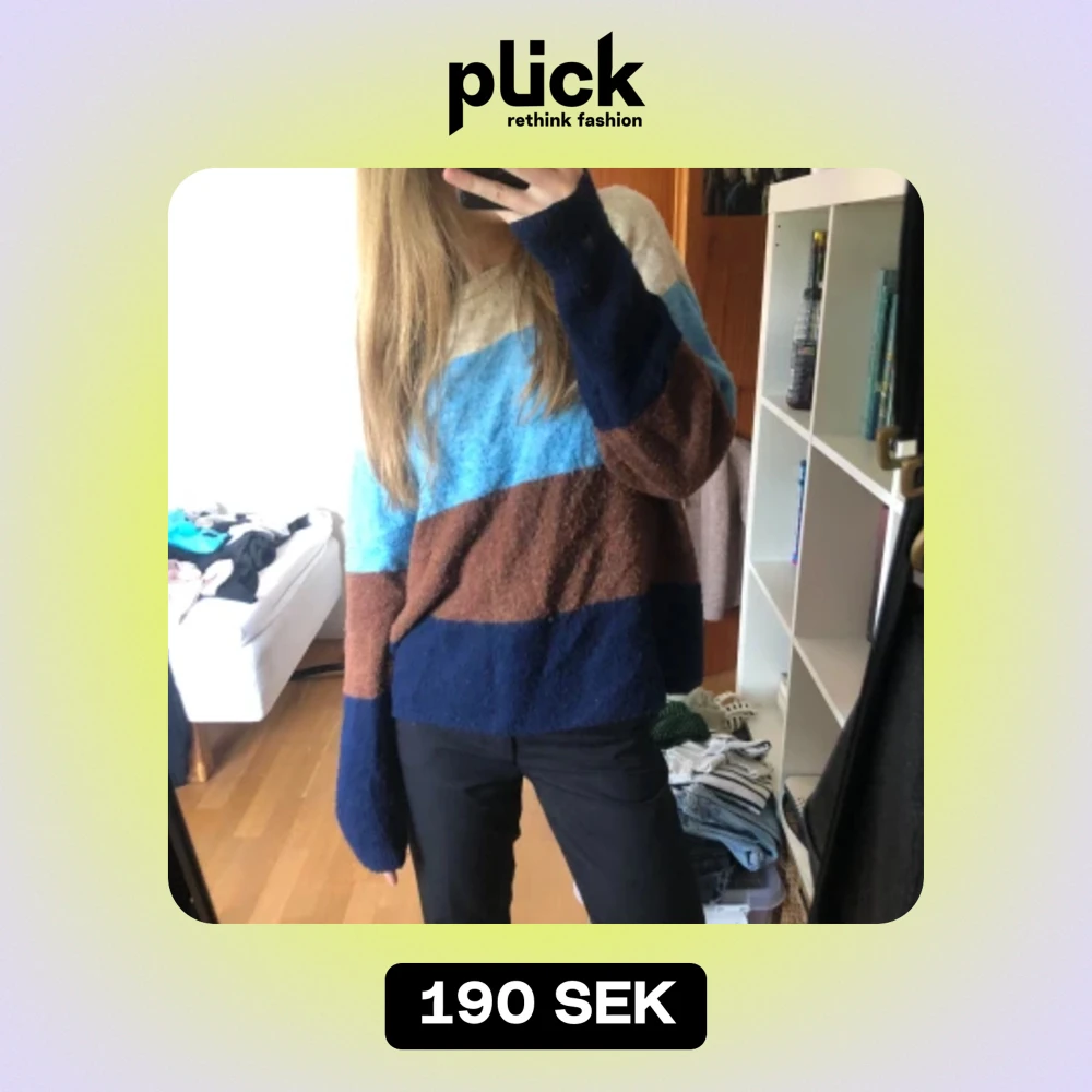 Riktigt cool flerfärgad stickad tröja 💜🧡🩵❤️Storlek xs men upplevs rätt oversize💝🤩köpt för flera år sedan på H&M därav använt skick men lika fin ändå!!!!!❤️