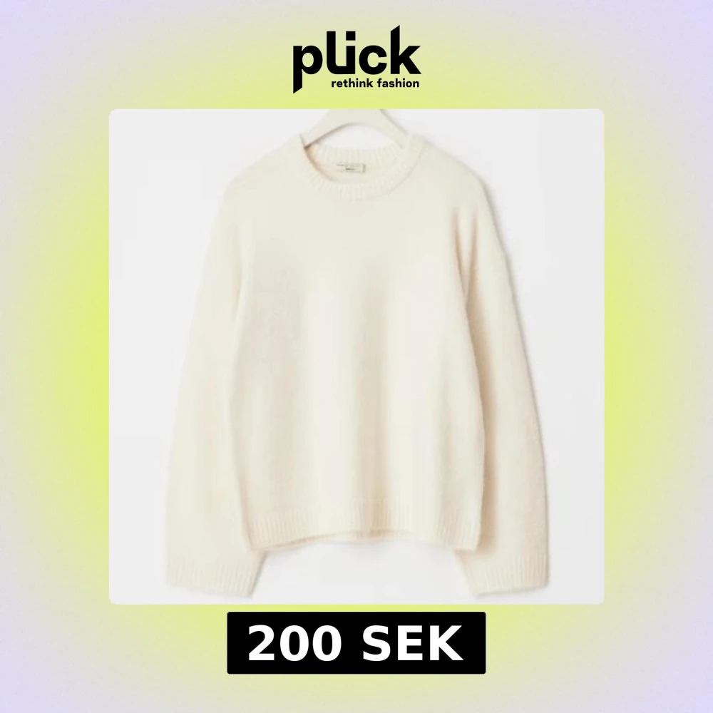 Supermysig vit stickad tröja med rund hals och breda ribbade muddar vid ärmslut och nederkant.