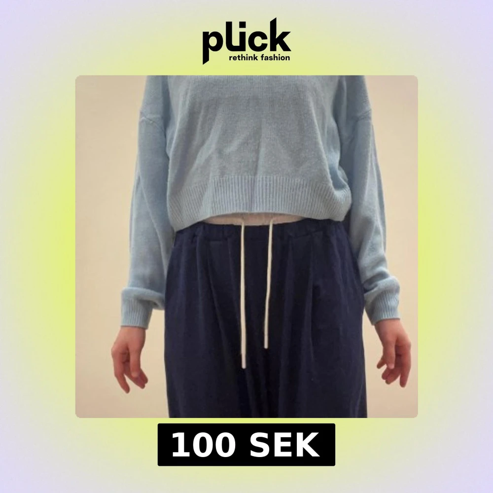 Supermjuk ljusblå stickad tröja med croppad passform och bred ribbad kant nertill. Tröjan har långa ärmar och en avslappnad, loose siluett som ger en chill vibe. Perfekt att styla med höga byxor eller kjol för en trendig look.