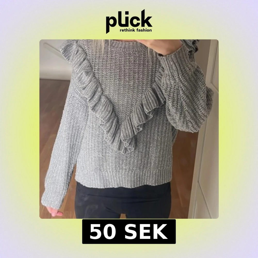 Säljer en snygg grå stickad tröja med volangdetaljer framtill. Tröjan har långa ärmar och en bekväm passform. Perfekt för kyligare dagar!