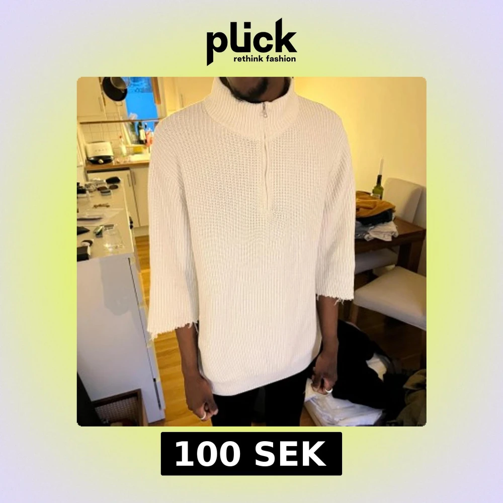 Säljer en vit stickad uniqlo tröja med hög krage och halv dragkedja framtill. Tröjan har trekvartsärmar med råa kanter och en avslappnad passform. Jag har klippt armarna.