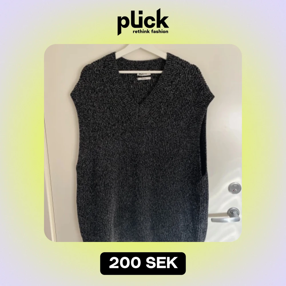 En mörkgrå stickad väst från COS, den är rätt oversized, storleken som står på är M men jag skulle säga att den är mer som en L/XL i kvinnliga storlekar. 61% bomull 39% ull