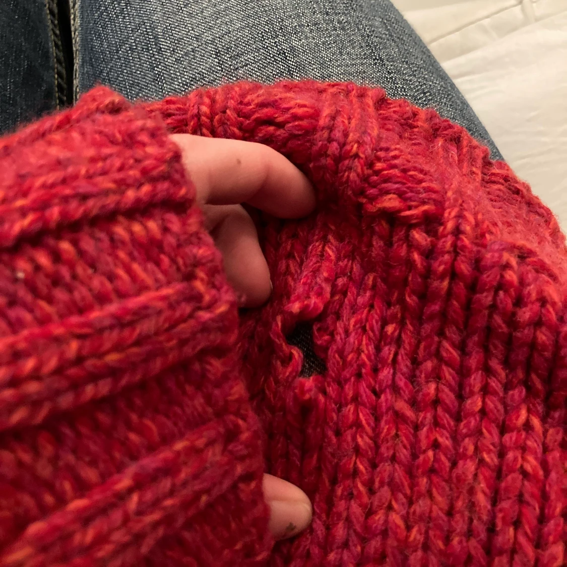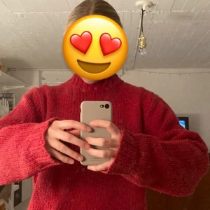 Stickad röd tröja från Filippa k❤️har ett litet hål som ni ser på andra bilden annars inga skador!