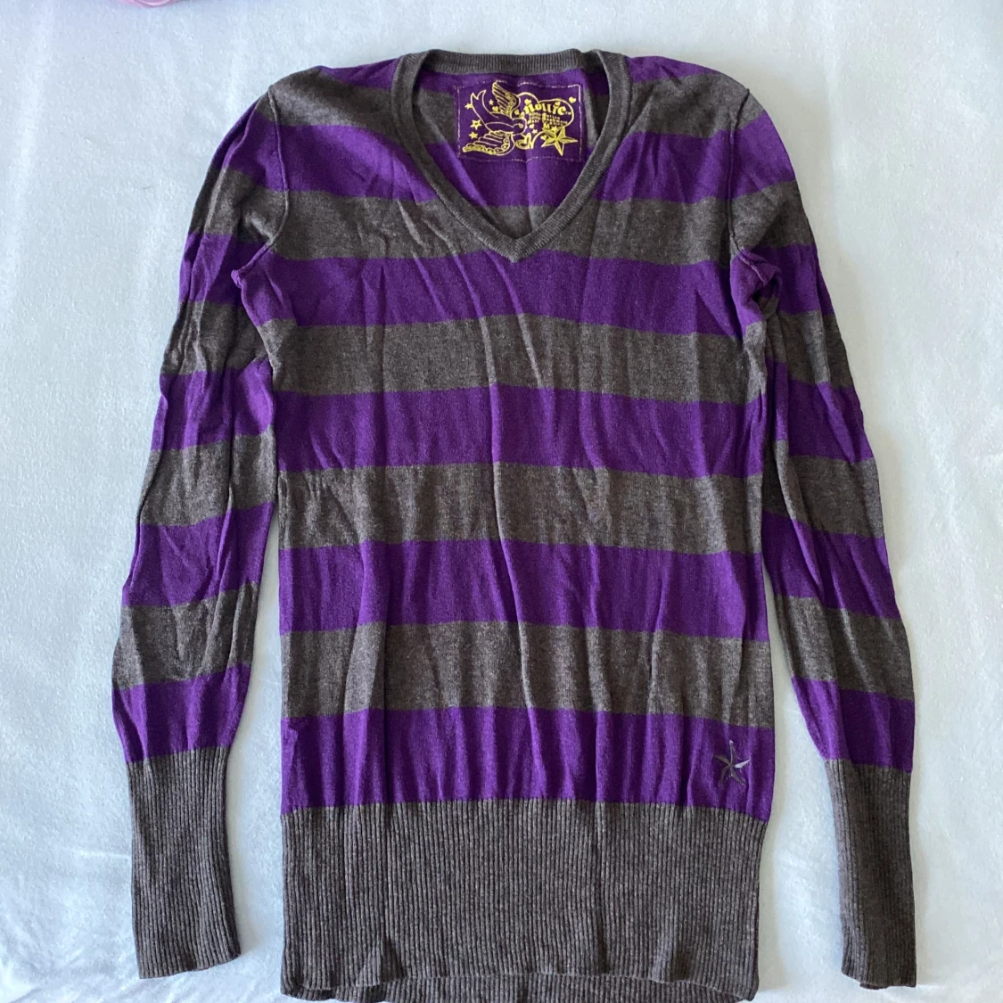 Säljer en grå och lila stickad tröja i jätte bra skick. Jag använder INTE köp nu!!💞