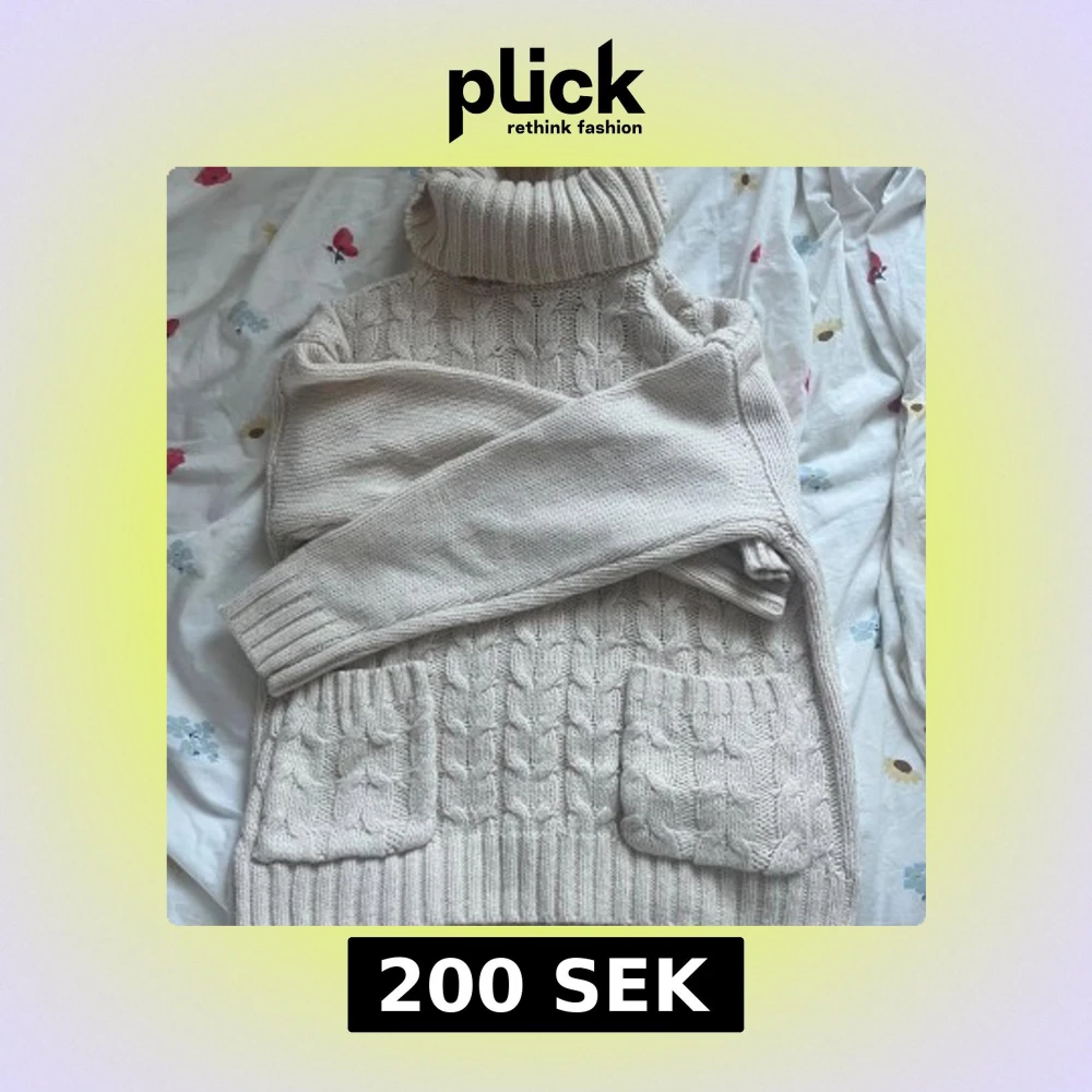 Mysig beige stickad polotröja med kabelstickat mönster och praktiska fickor framtill. Perfekt för kyliga dagar med sin höga krage och långa ärmar.