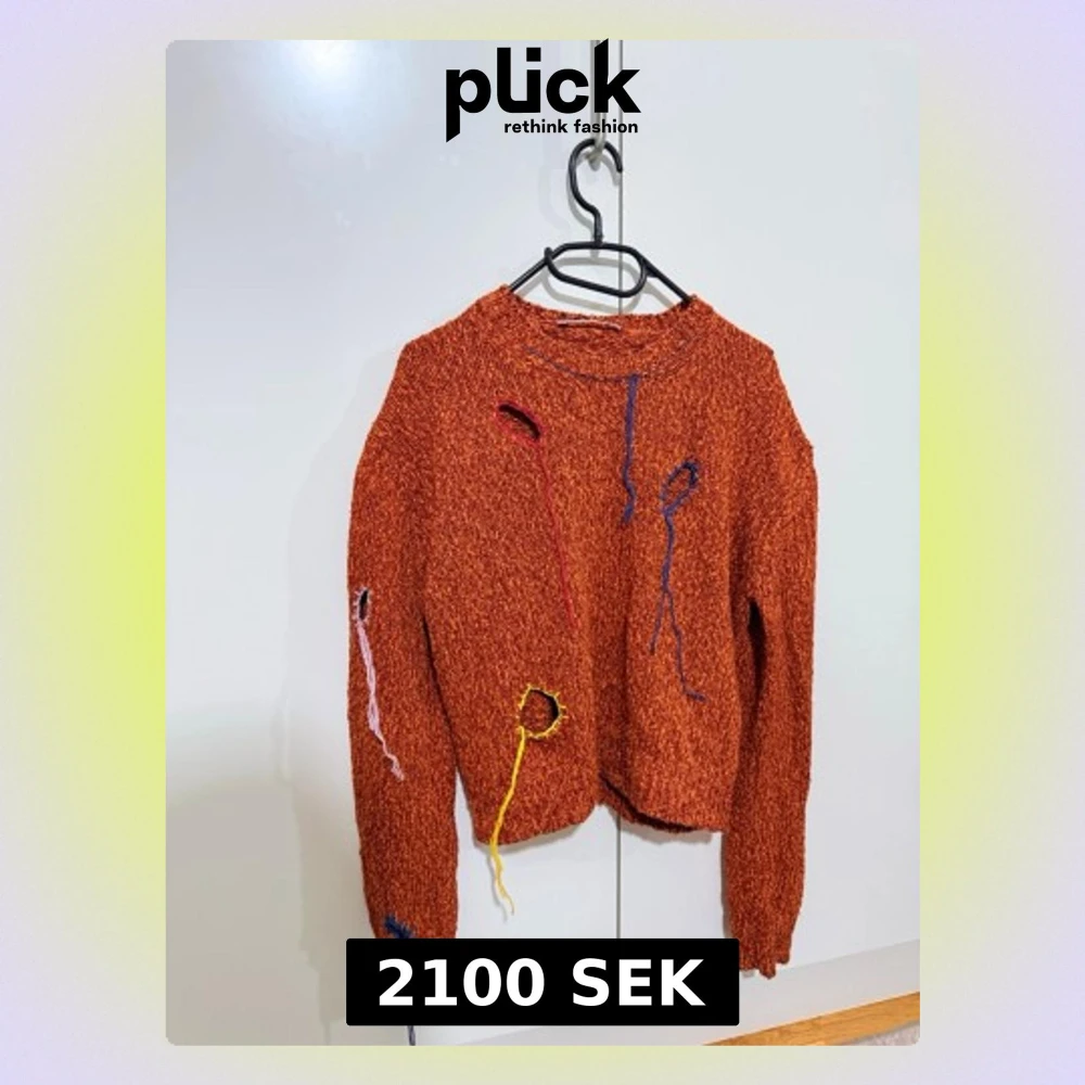 Unik orange stickad tröja från Acne Studios med färgglada broderade detaljer och hål med kontrasttrådar i blått, rosa och gult. Tröjan har en loose passform och långa ärmar, perfekt för dig som gillar statement-plagg och kreativ design.