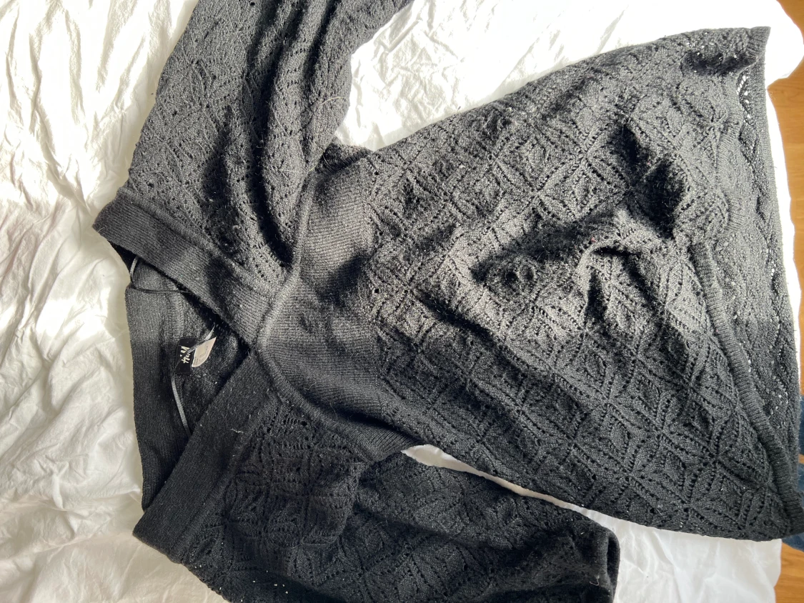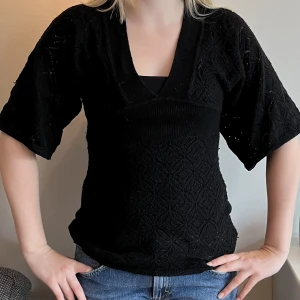 Svart trekvartslång stickad tröja, lite vringad med en tajtare del under bröstet! Obs, jag har linne på mig under. Skriv för fler bilder eller frågor🌸