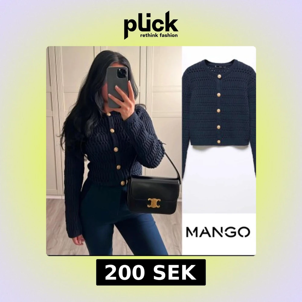 Snygg mörkblå stickad kofta från Mango med dekorativa guldknappar framtill. Koftan är lite urtvättad och lite nopprig se bilder men generellt fortfarande i bra skick.