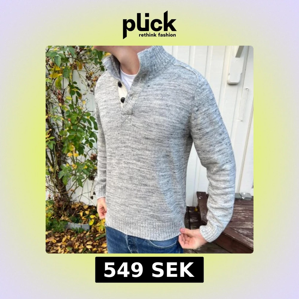 Snygg grå stickad tröja med ribbad hög krage och tre svarta knappar framtill. Tröjan har långärmad passform och är tillverkad i mjukt stickat material som ger en chill och stilren look. Perfekt att bära över en t-shirt för extra lager. Den har en lagning i ena armhålan men är inget märkvärdigt. Annars helt felfri och redo för en ny köpare! Skriv vid funderingar🙌🤝