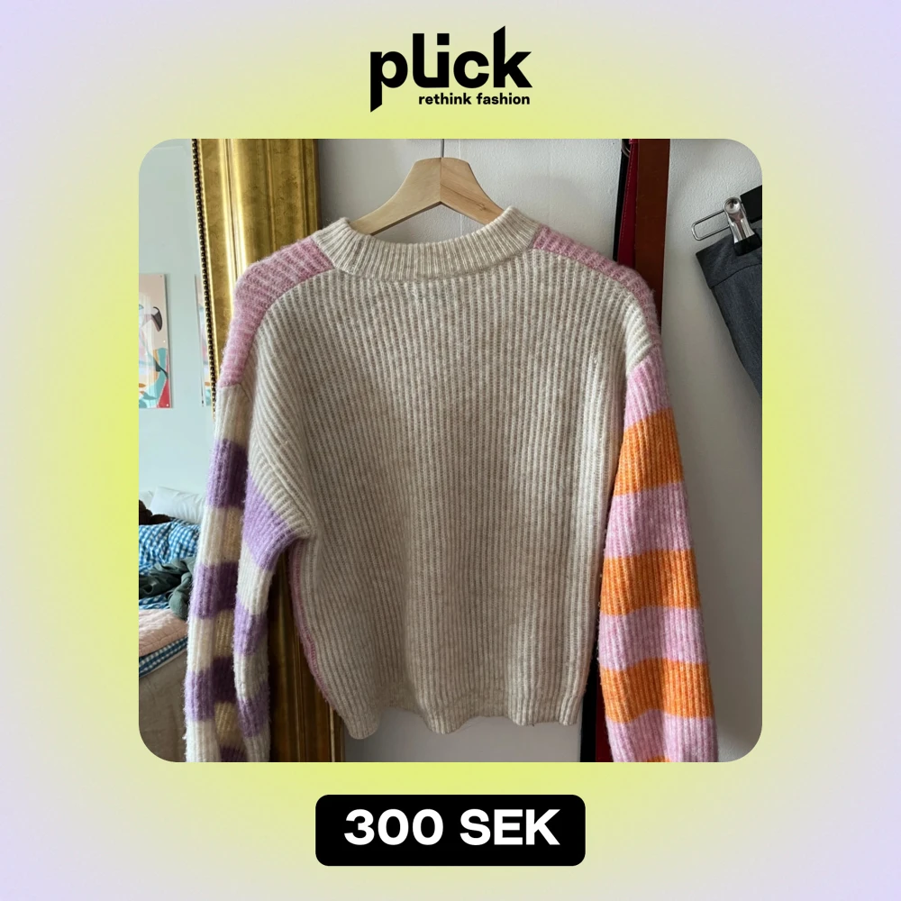 Fin och mysig stickad tröja från Envii med randigt mönster i rosa, lila, orange och beige/vit. Modellen heter Envii Enhero LS knit. Storlek XXS men passar XS-S också. Kan skickas mot fraktkostnad eller hämtas i centrala Stockholm. Material 44% återvunnen polyester, 40% polyamid, 12% Ull, 2% akryl, 2% viskos