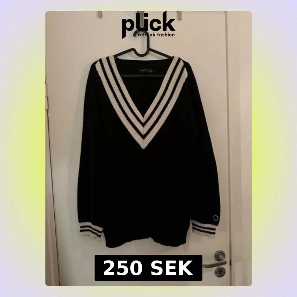 Svart stickad tröja från Stockh LM med bred v-ringning och vita samt svarta ränder längs halsen och ärmsluten. Är större i Stl och mer som M/L