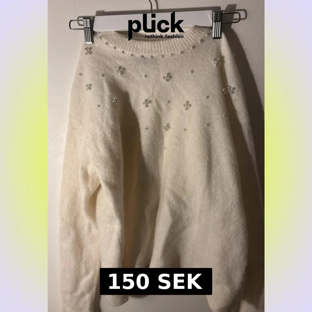 Supermysig vit stickad tröja från Stockh LM med pärldetaljer över bröstet och axlarna. Tröjan har rund hals, ribbade muddar och lång ärm. Perfekt för dig som gillar en clean look med lite extra bling. Storleken är ursprungligen M men har krympts i tvätten och passar mer som en XS, kanske även S