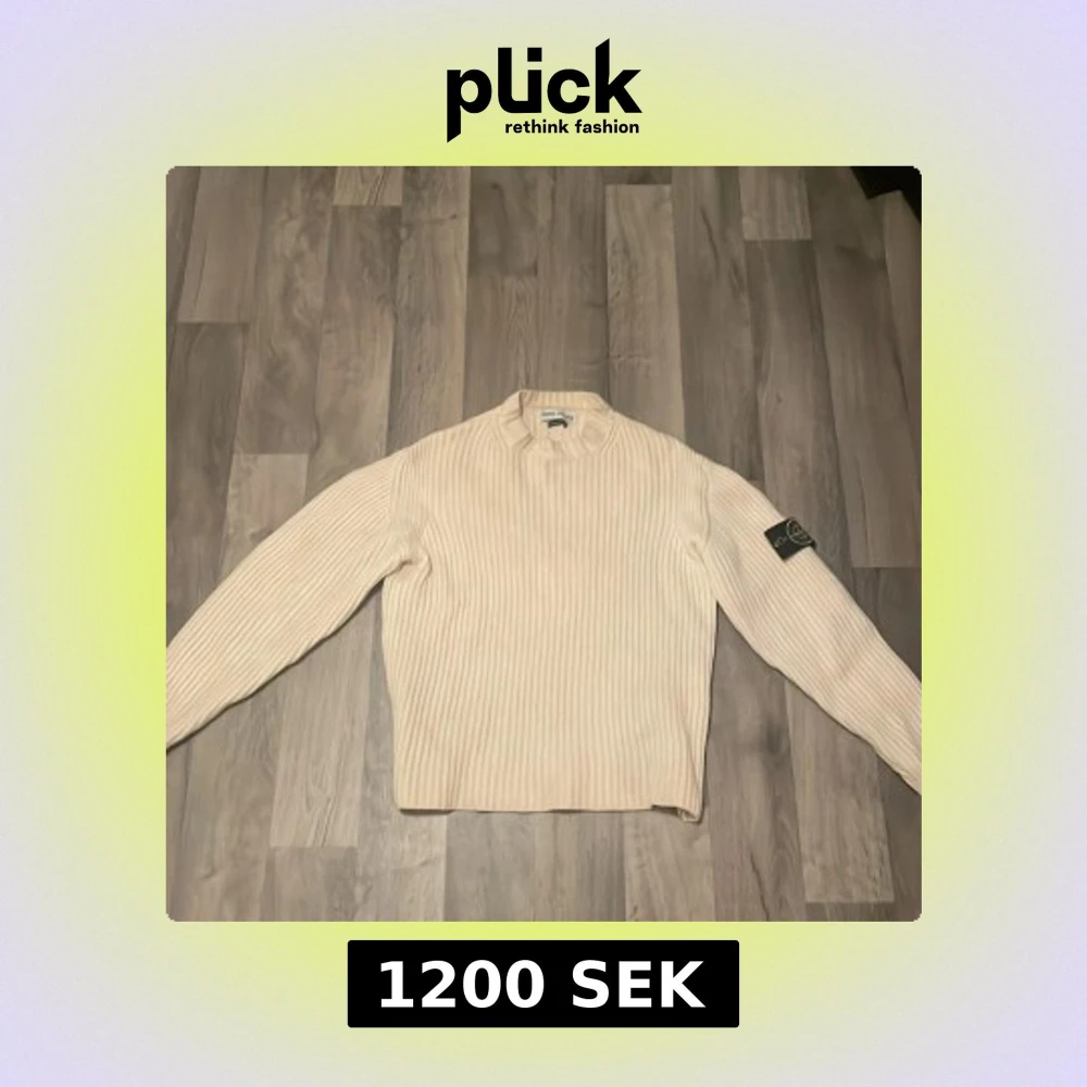 Säljer en beige stickad tröja från Stone Island med klassisk patch på ärmen. Tröjan har ribbat mönster, lång ärm och hög hals. Perfekt för dig som gillar streetwear och vill ha något stilrent men ändå unikt.