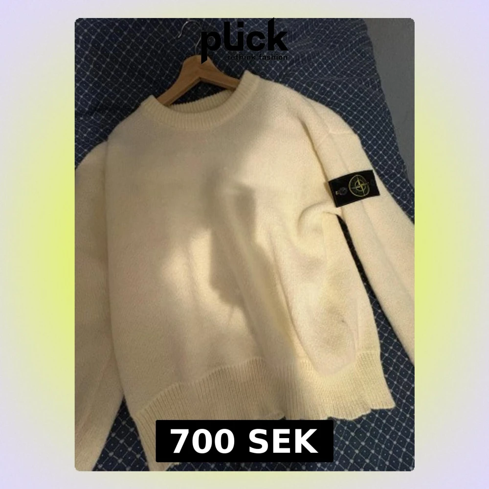 Säljer en clean stickad tröja från Stone Island med klassisk patch på ärmen. Tröjan har rund halsringning, ribbade muddar och en mjuk, fluffig känsla. Perfekt för lager-på-lager och snygg till jeans eller cargobyxor.